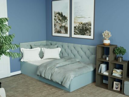 Кровать Бриони обладает элегантным лаконичным дизайном и изящно впишется в детскую комнату, спальню или гостиную. Модель можно использовать в том числе как диван, поскольку она оснащена уютным угловым изголовьем. Спинка мебели получила мягкую стёжку, оформленную каретной стяжкой. Пуговицы обтянуты той же тканью, что и основное изделие. Угловая структура кровати позволяет существенно сэкономить пространство и обеспечить при этом комфортный отдых.