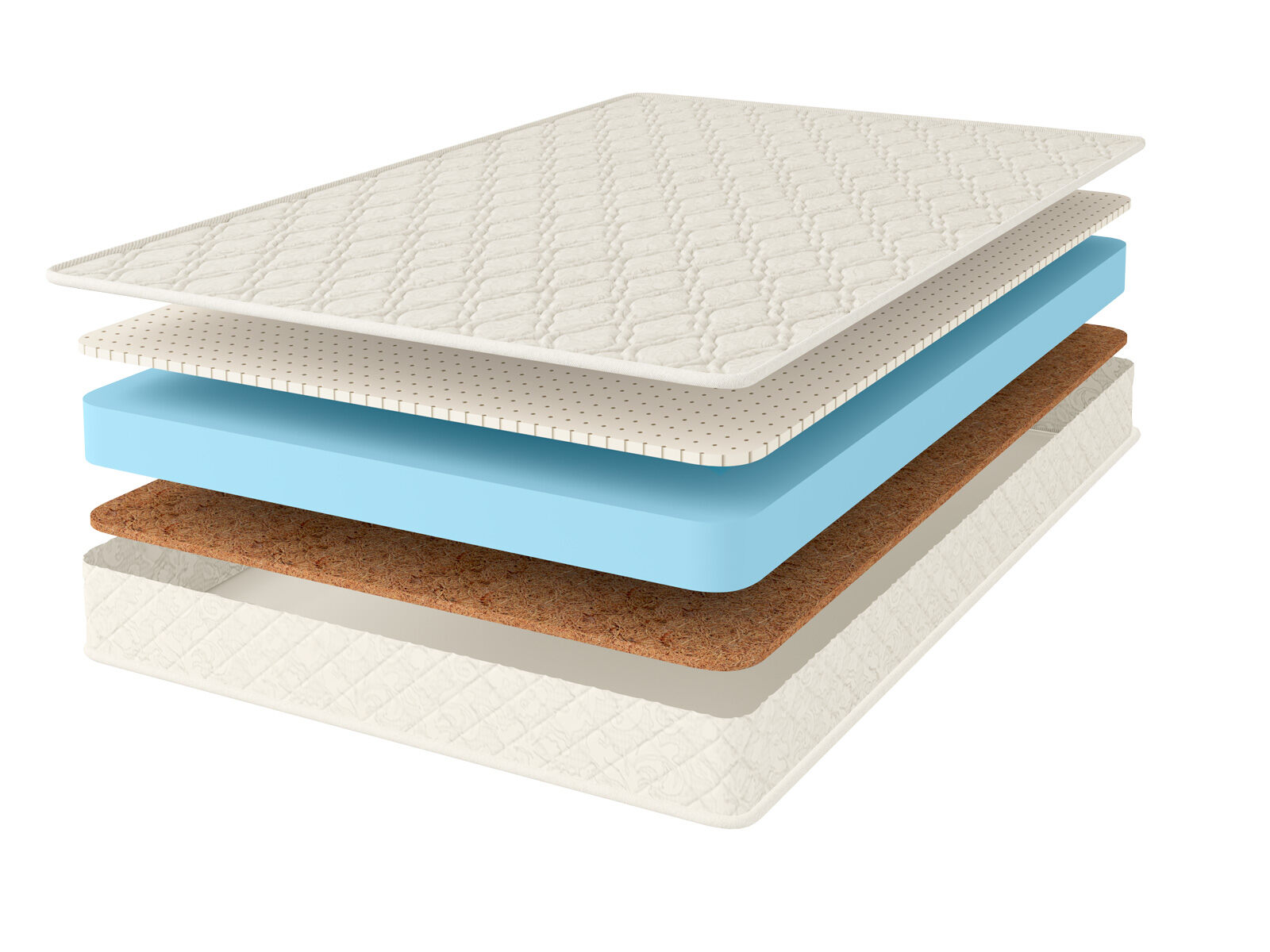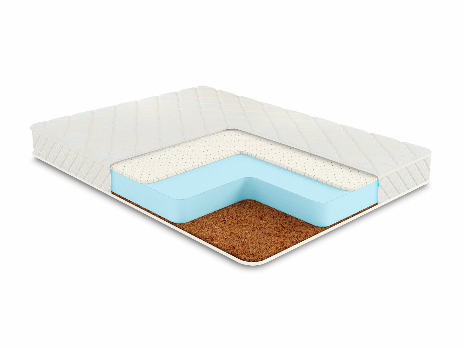 Природные койра и латекс проложены сразу у поверхностей, чтобы передать спальным местам свои качества. Койра обеспечивает сторону жёсткостью и упругой поддержкой, а латекс даёт адаптивность – материал подстраивается под особенности фигуры, повторяя каждый сантиметр тела.