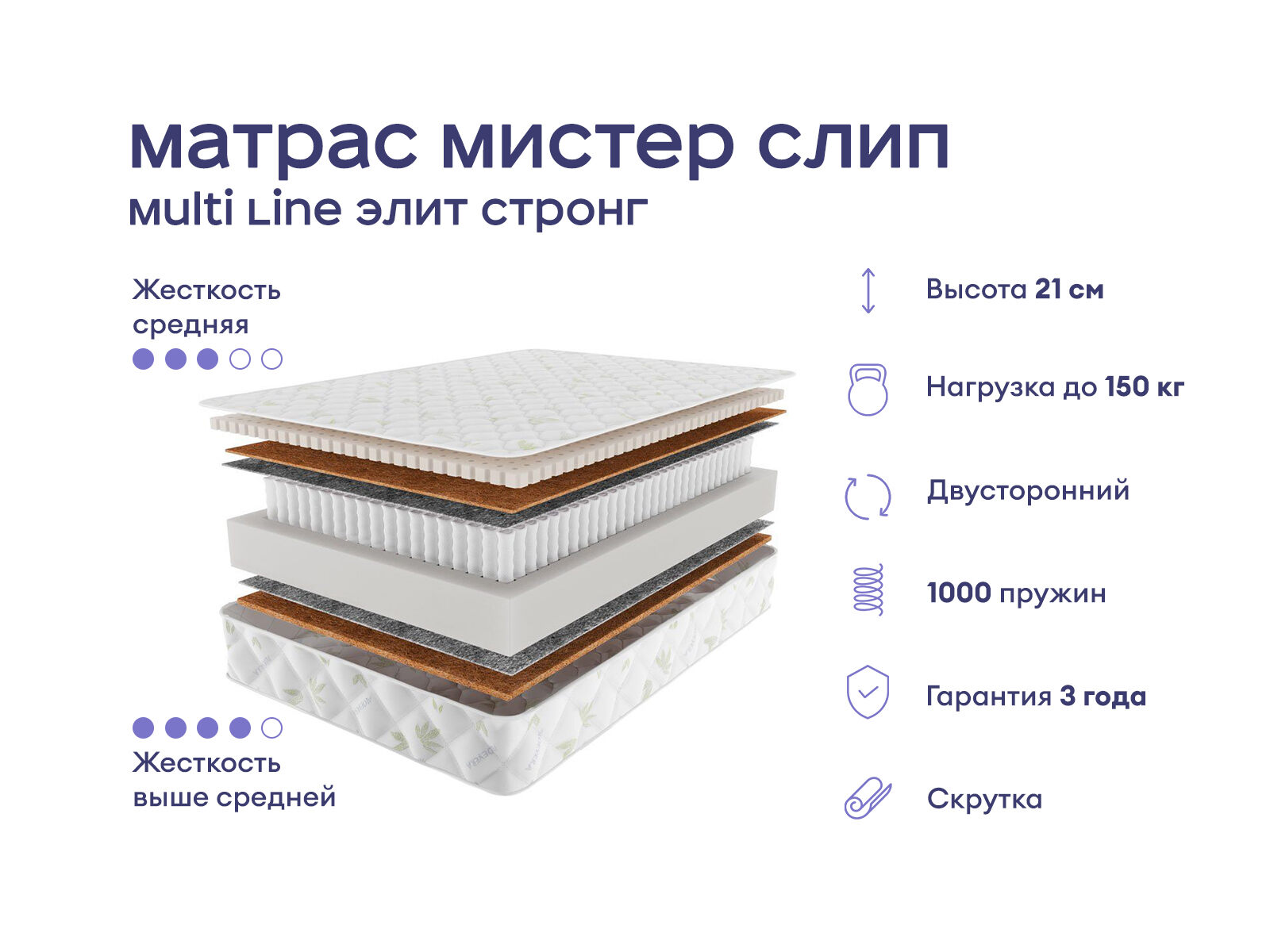Двусторонний матрас с качественными натуральными наполнителями, включающий слой мягкого латекса, кокосовую койру и усиленный пружинный блок. Эти материалы обеспечивают надёжную ортопедическую поддержку и комфорт, оставаясь практичным выбором для тех, кто ценит долговечность и природные свойства натуральных слоев. Сразу две стороны жёсткости позволяют выбрать уровень поддержки и комфорта.