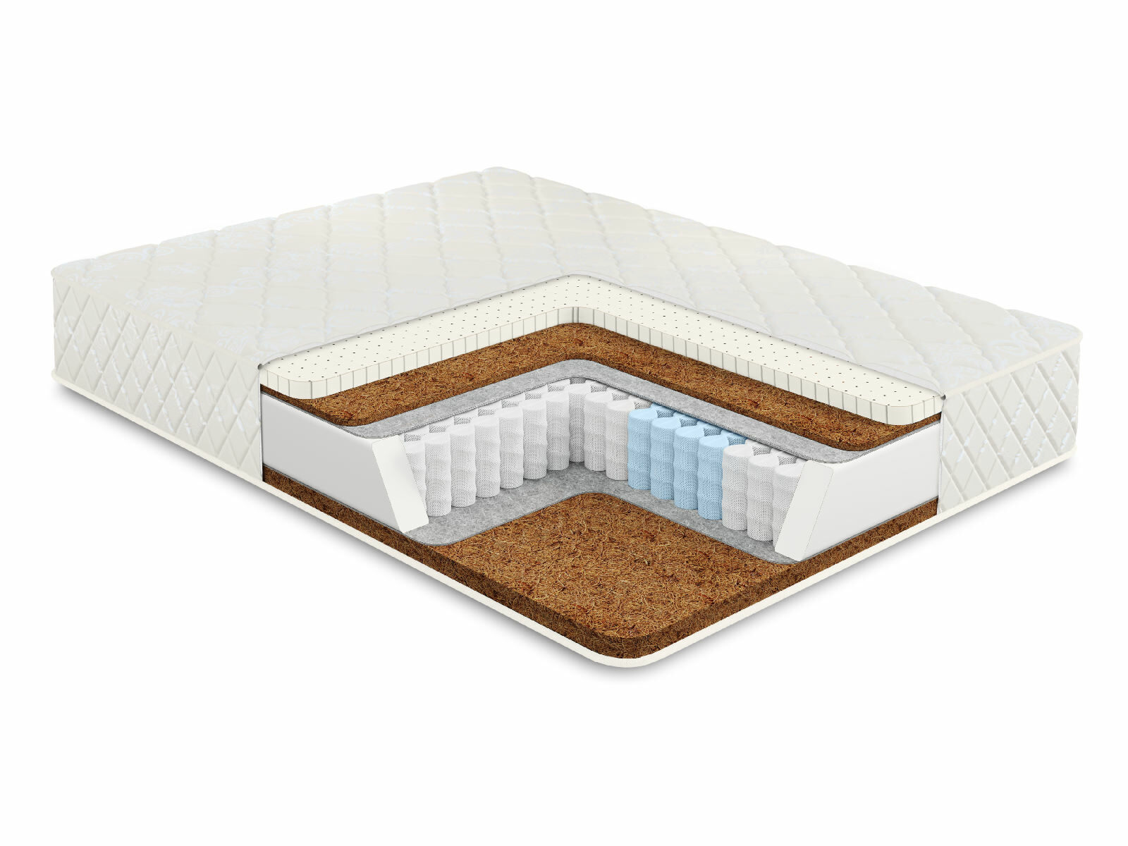 Внутри модели присутствует койра кокоса и натуральный латекс. Это одни из самых ценных для набивки материалов. Поскольку их не просто добыть из-за их природного происхождения и служат они значительно дольше искусственных компонентов, то и цена на такие материалы естественно выше. Однако если вы предпочитаете приобрести качественное изделие на долгие годы эксплуатации, то именно такие наполнители обеспечат безупречную работу матраса на десятилетия.