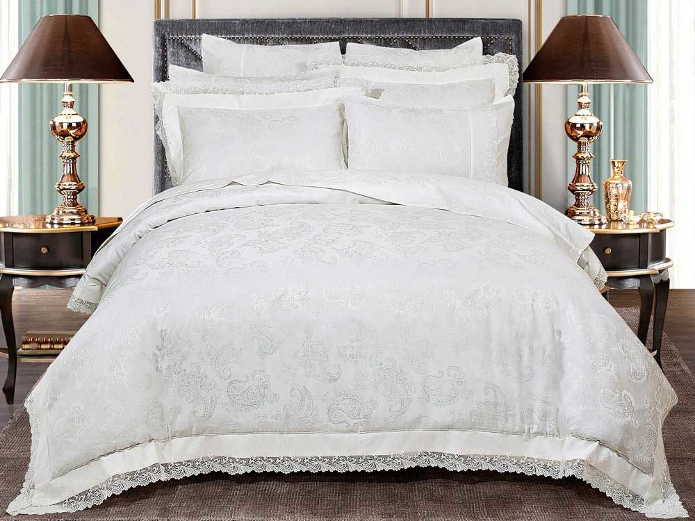 Верх пододеяльника и наволочек - жаккардовый люкс-сатин (55% вискоза, 45% хлопок). Оборотная сторона пододеяльника, наволочек и простыня - люкс-сатин (100% хлопок).