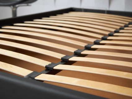 Коробочный каркас кровати собран из ДСП. Это прочный и надёжный материал, который широко используются в мебельной промышленности и органично переносит нагрузки.