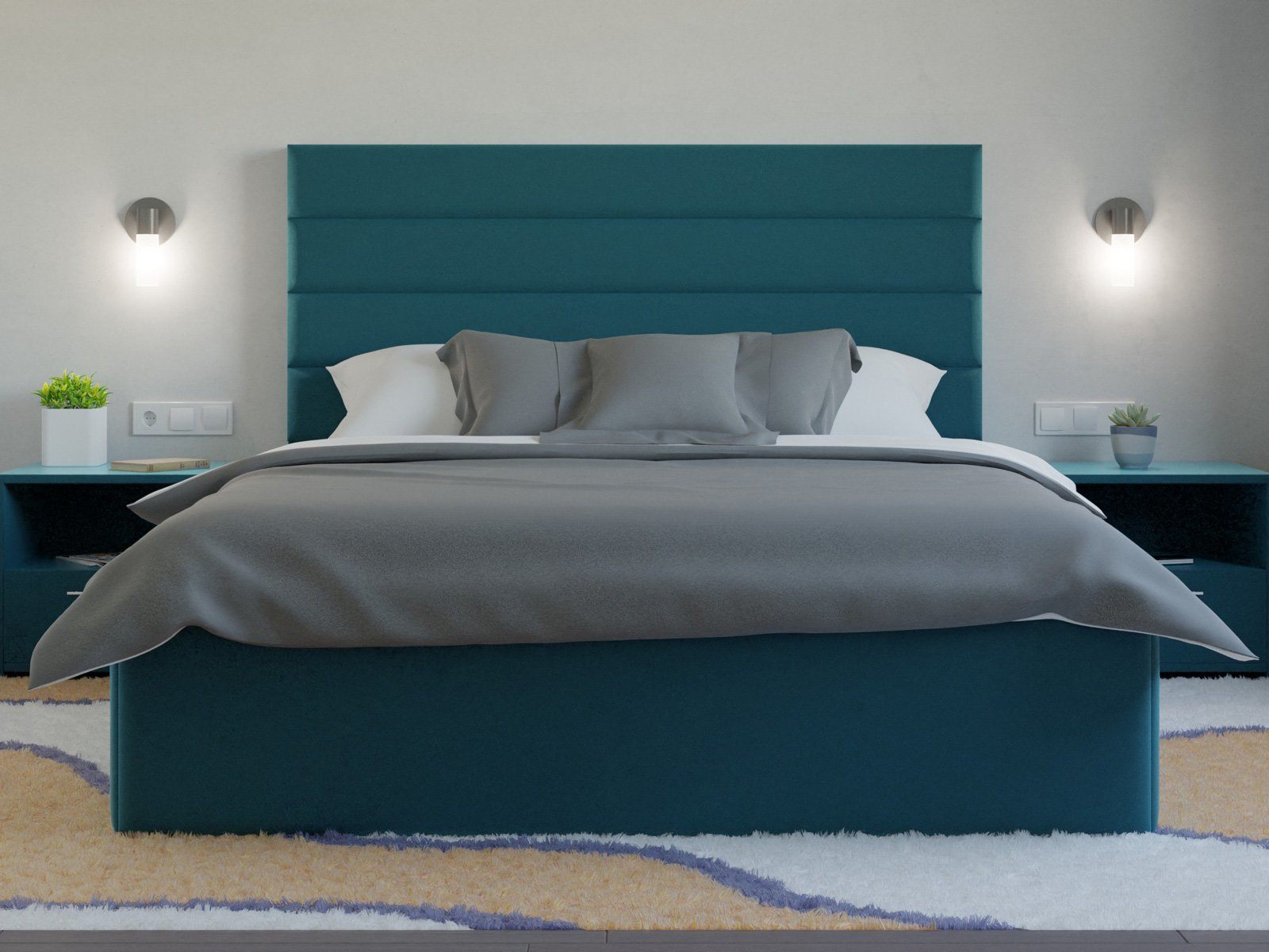 Мягкая кровать с обивкой из велюра.