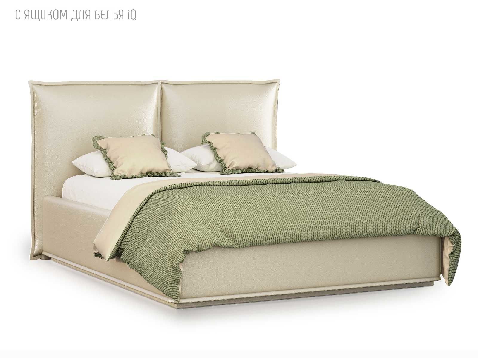 Кровать укомплектована IQ с подъемным механизмом и ящиком для белья без дна (дополнительная платная опция - дно к ящику IQ из HDF (ХДФ). Каркас кровати на цоколе, декоративный чехол на цоколе съёмный. Глубина ящика для белья - 30 см, без ограничения нагрузки на ящик.