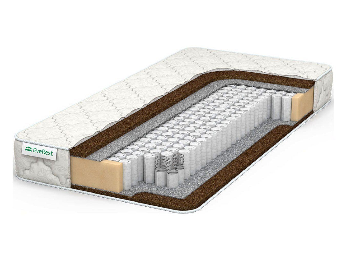 В качестве настилочного слоя в матрасе реализован бикокос. 2 блока по 2 см в толщину симметрично установлены по сторонам от пружинной сердцевины. Такое расположение слоев позволяет добиться равной жёсткости у той или иной половины изделия.