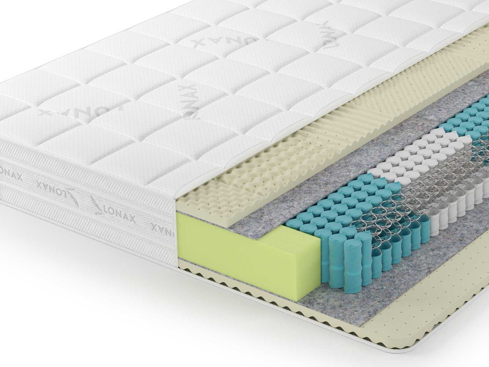 Слои латексной пены также имеют специальную структуру. Полотно наполнителя поделено на 7 зон, где каждая из областей имеет собственную плотность и разновидность фигурной резки. Сделано это для того, чтобы более качественно адаптироваться под фигуру. Например, в местах с наибольшей нагрузкой, где приходятся бёдра и плечи, пена получила более интенсивную плотность.