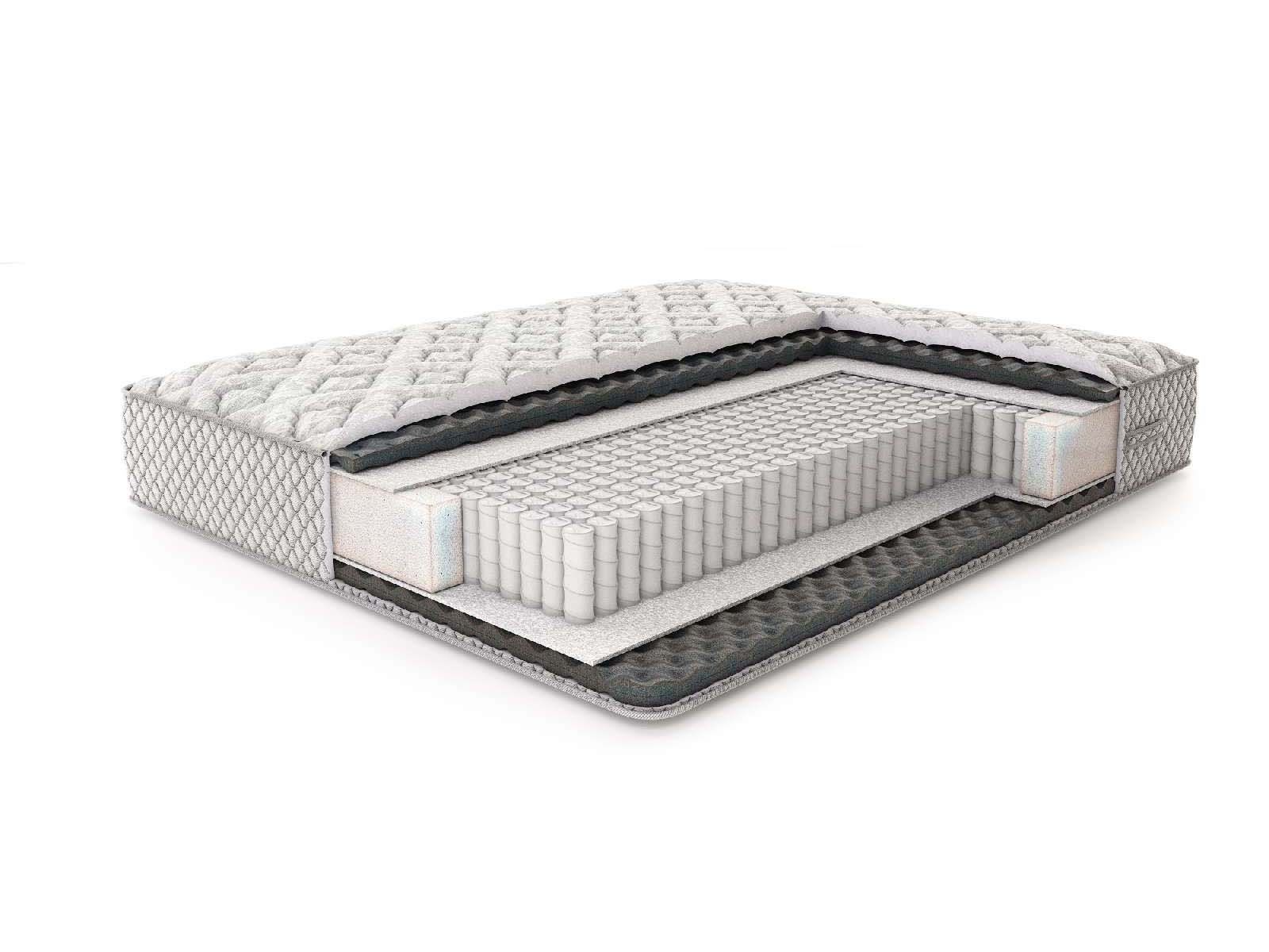 Для обивки матраса реализован жаккард, который дополнительно простёгивается на объёмном волокне холлкона 300 гр., ППУ 1 см и спанбонде. Бурлет модели сшит из мебельного жаккарда на ППУ.