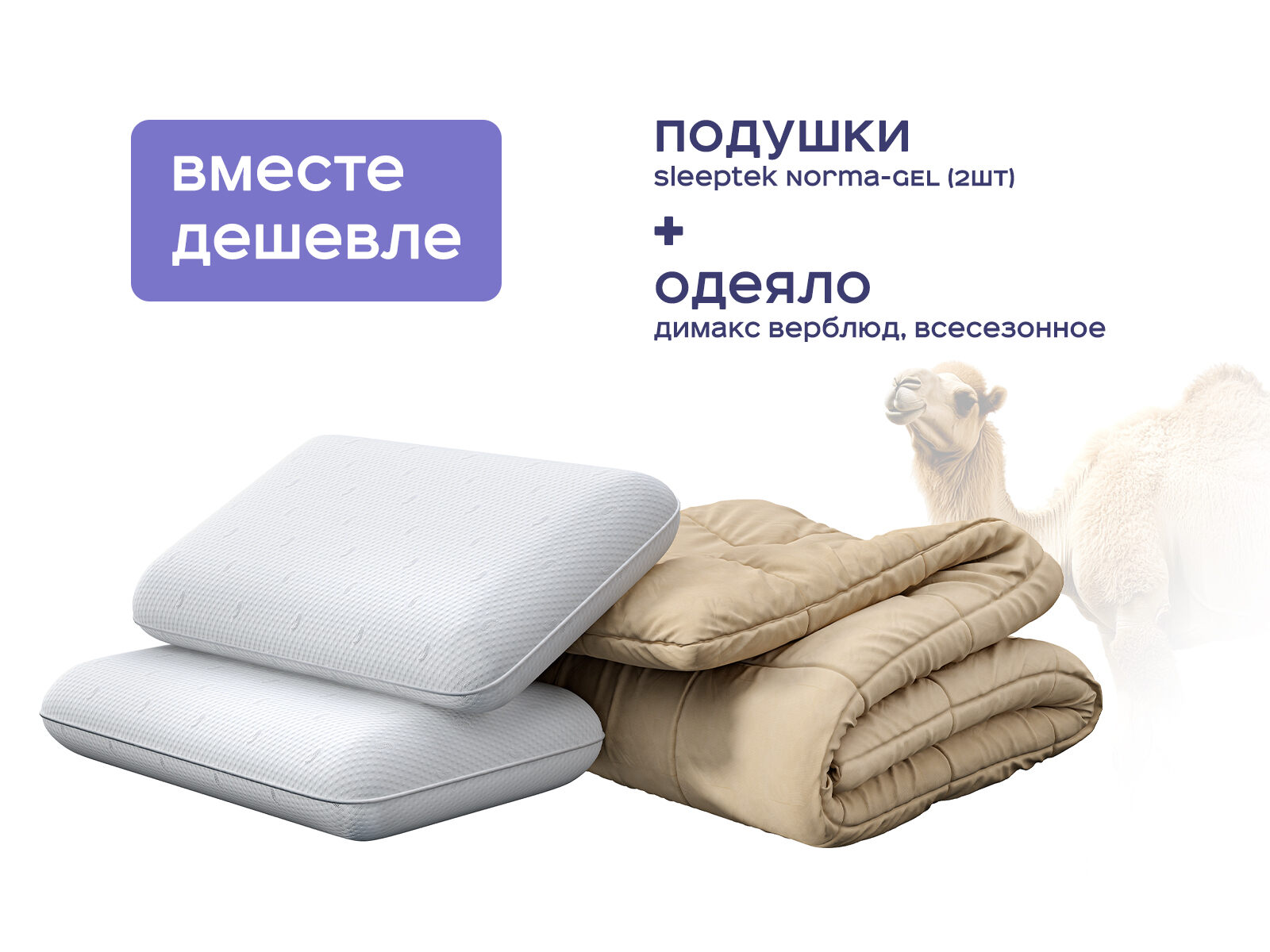 Комплект одеяло Димакс Верблюд всесезонное + подушка Sleeptek Norma-GEL 2 шт. — идеальное сочетание природных материалов и инновационных технологий для вашего сна. Покупая набор, вы экономите до 39% и получаете одеяло из верблюжьей шерсти с уникальной терморегуляцией и две подушки с охлаждающим гелем, которые вместе создают условия для глубокого восстановления. Этот комплект работает как «природный термостат» в одном решении.