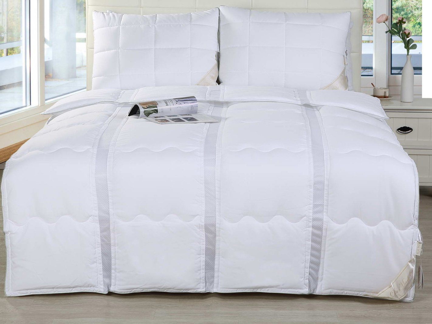 Одеяло с прослойками сетки, что придает ему дышащие свойства.