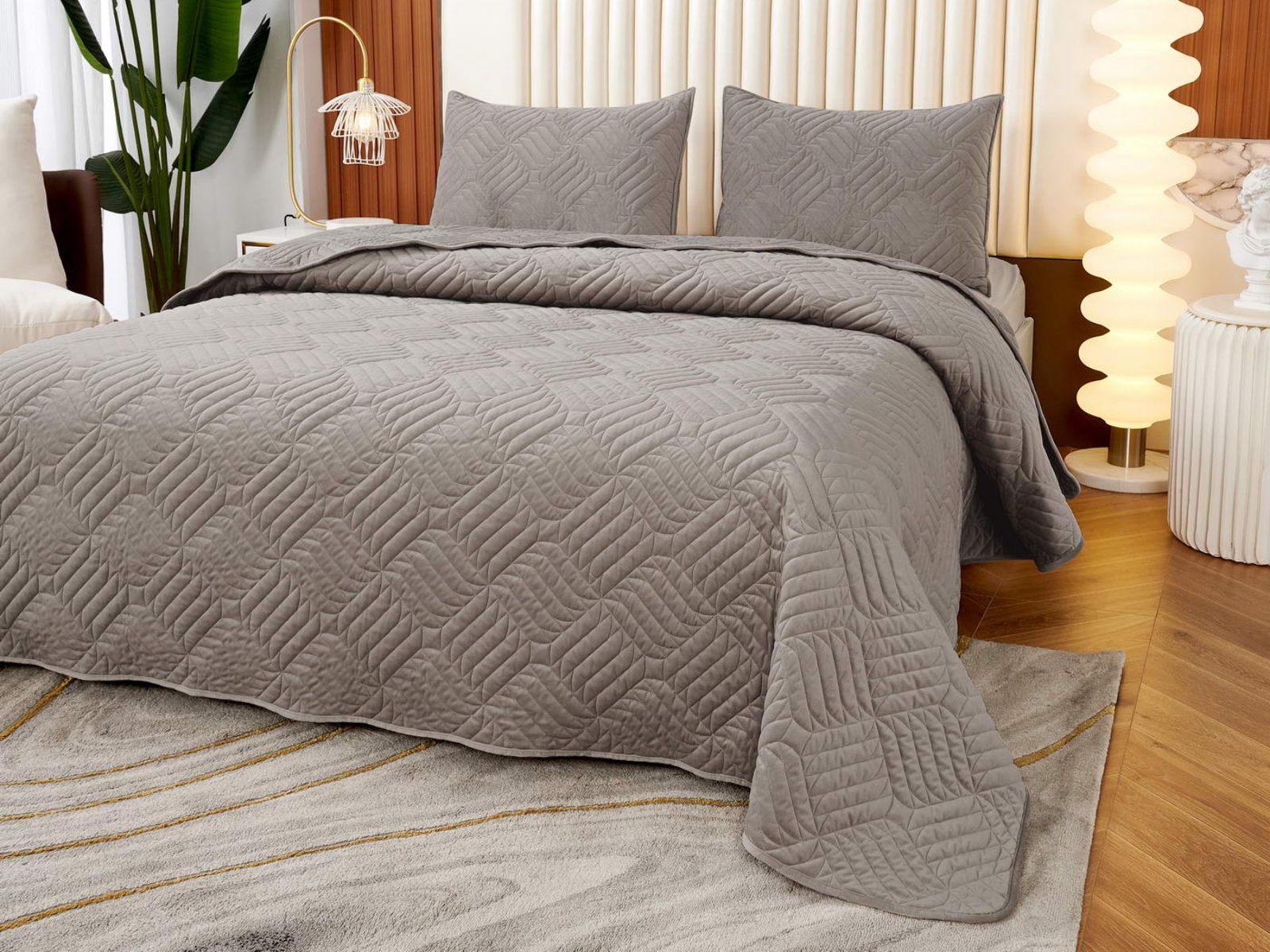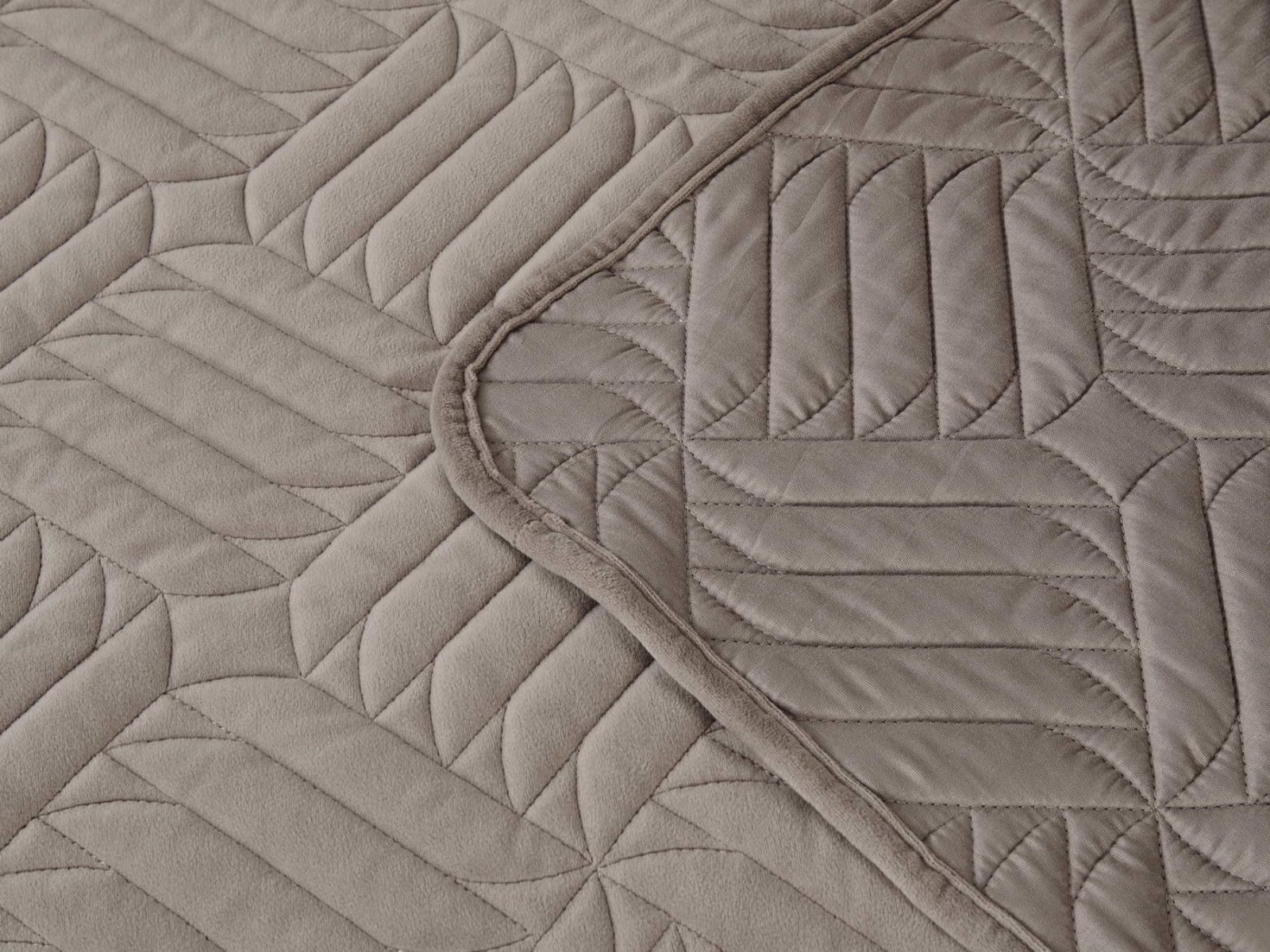 Покрывала выполнены в 10 оттенках: крем, мокко, пепельный, песочный, светло-бежевый, светло-серый, серый, темно-серый, чайная роза и черный. Стежка в виде геометрического орнамента подойдет к любому современному интерьеру. Из-за особого плетения, велюровая ткань покрывала отражает свет и красиво переливается при различном освещении.