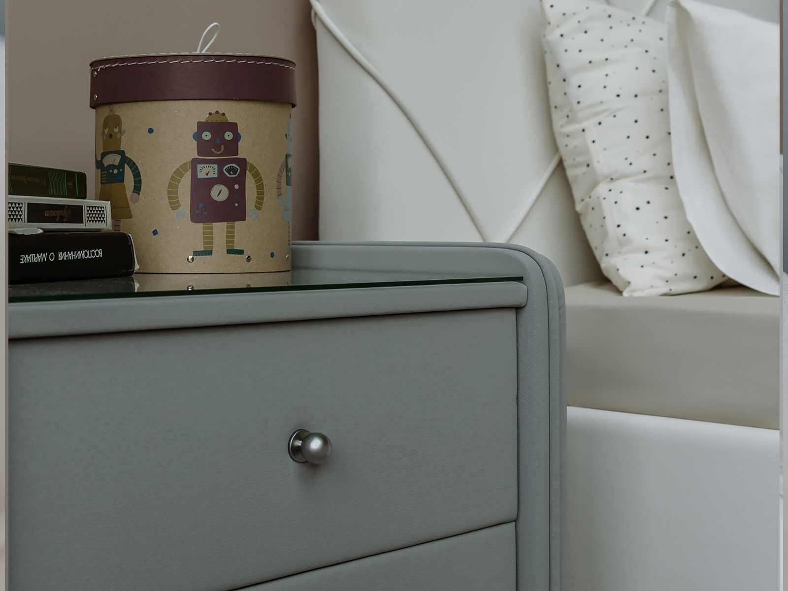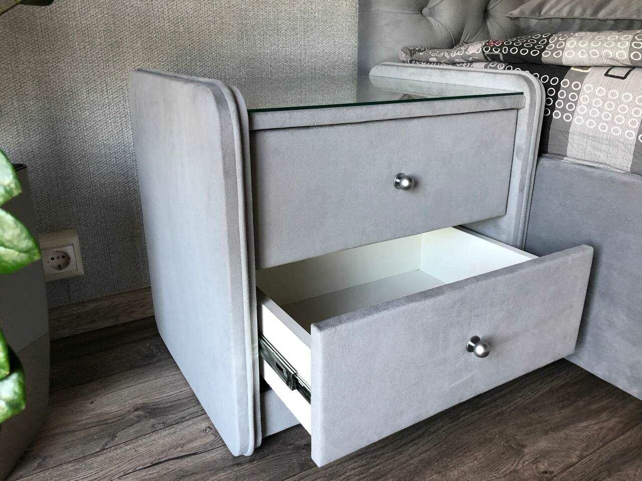 Тумба прикроватная Сандрига выполнена в изысканном классическом стиле. Обивка из высококачественного материала придает мебели особый шарм. Модель легко впишется в современные интерьеры и станет практичным дополнением меблировки спальни. На стеклянной столешнице расположится ночник, книга или чашка чая, а для необходимых под рукой мелочей предусмотрены два выдвижных ящика с ручками.