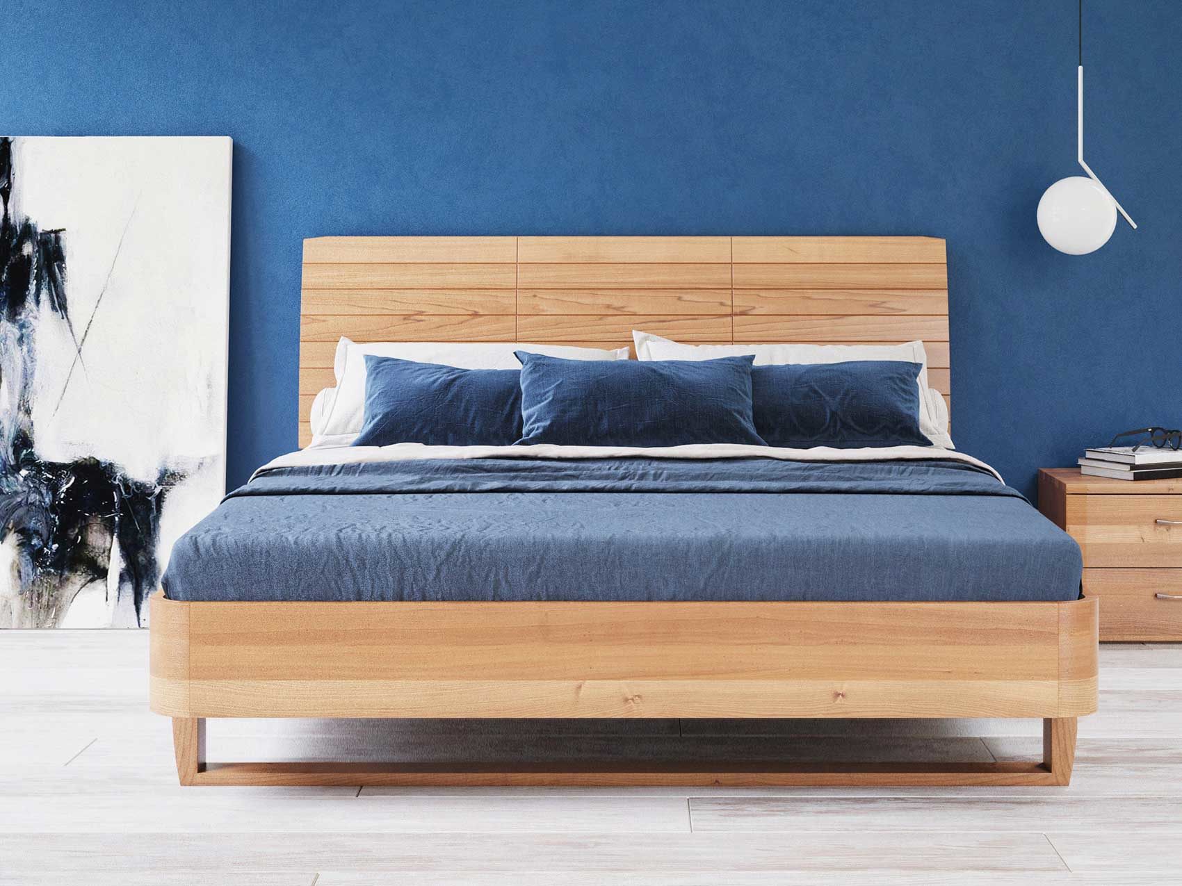 Корпус кровати Сен Реми изготовлен из массива ясеня. Изголовье высотой 104 см представляет собой деревянные пластины, установлены под углом. За счет этого получается слегка выгнутая поверхность удобная для спины, если расположиться сидя на постели. Укомплектована основанием из массива ясеня. Габаритные размеры: 6,8 см к ширине и 16 см к длине спального места. Не комплектуется ящиком для белья с подъемным механизмом.